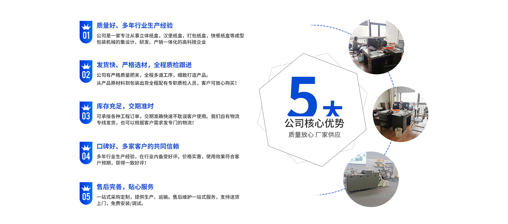 瑞安市中法機(jī)械有限公司是一家從事立體紙盒機(jī),漢堡紙盒機(jī),打包紙盒機(jī),快餐紙盒機(jī)等成型包裝機(jī)械的設(shè)計(jì)、研發(fā)、產(chǎn)銷(xiāo)一體化的高科技企業(yè)。公司有現(xiàn)代化的管理體系和完善的售后服務(wù)體系;有一支具有充滿(mǎn)青春活力的精銳研發(fā)團(tuán)隊(duì)!自成立以來(lái),中法公司堅(jiān)守“誠(chéng)信、學(xué)習(xí)、發(fā)展”的企業(yè)發(fā)展理念,堅(jiān)持“以誠(chéng)信為道、以質(zhì)優(yōu)取勝”的經(jīng)營(yíng)原則,在市場(chǎng)競(jìng)爭(zhēng)中取得了良好的社會(huì)和經(jīng)濟(jì)效益!